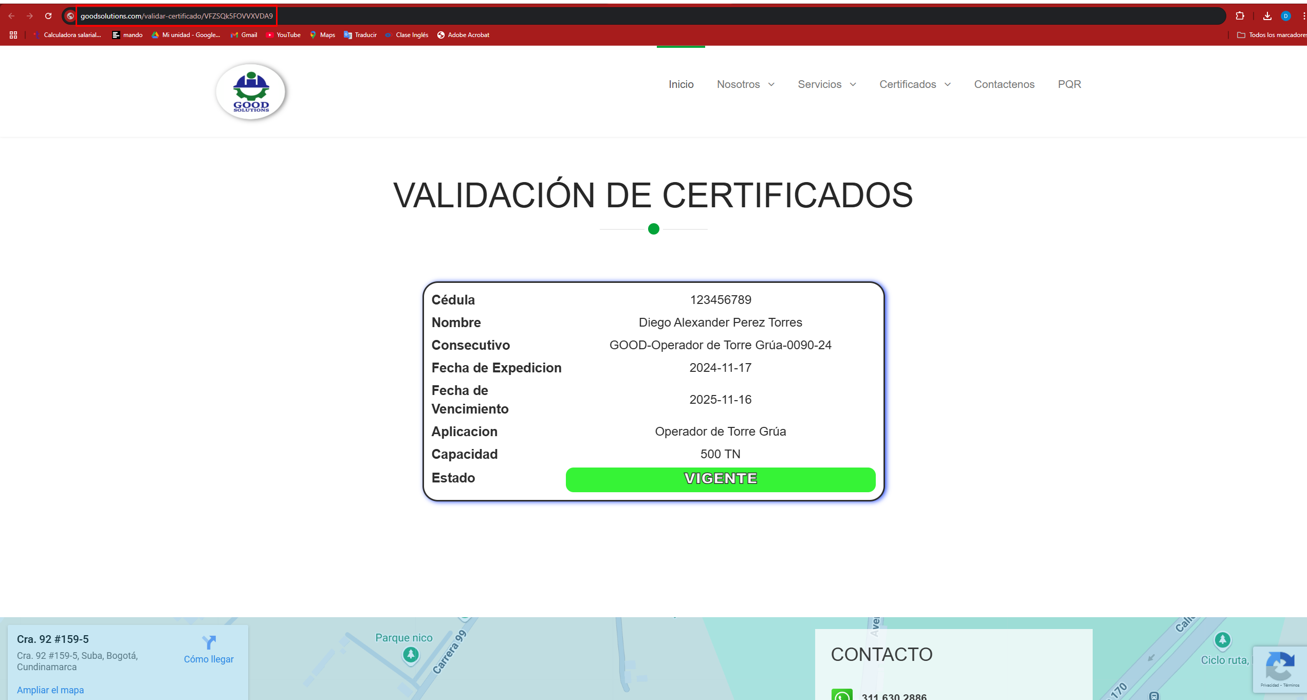 Asegúrate de que al leer el QR de tu carnet, te dirija a 'https://goodsolutions.com.co/validar-certificado/' y no a otro sitio. Además, revisa que la página web a la que hayas sido redirigido contenga nuestro menú de opciones en la parte superior y el formulario de contacto con la ubicación de nuestras oficinas en la parte inferior.